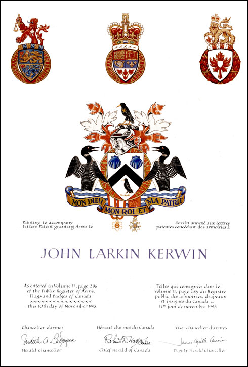 Arms of John Larkin KerwinBlazonArgent a chevron Sable between two escallops Azure and in base a Cornish chough Proper; |