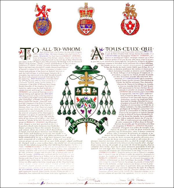 Arms of Marcel GervaisBlazonArgent a tree Vert perched on its branches a bird Gules between two birds the dexter contourné Azure the sinister Purpure and volant above its crown a bird descending in bend reversed Azure between two birds respectant Gules and flanking its trunk two birds respectant wings elevated and addorsed Purpure all birds embellished Or on a chief Vert between two sprigs each composed of a trillium flower a lily and a prairie crocus proper on one stem Or an open book proper edged and bound Or charged with a cross moline Vert; |