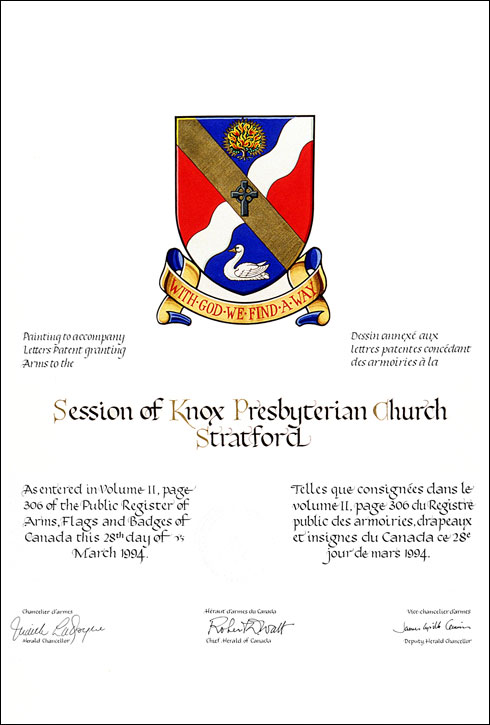 Arms of the Session of Knox Presbyterian Church of StratfordBlazonPer saltire Azure and Gules a bend reversed wavy Argent surmounted by a bend Or charged in centre point with a Celtic cross Sable in chief a representation of the Burning Bush proper irradiated Or and in base a swan naiant Argent beaked Or; |
