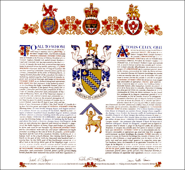 The contents of this Register are intended for research purposes only. The heraldic emblems found in the Register may not be reproduced in any form or in any media without the written consent of the Canadian Heraldic Authority and/or the recipient.