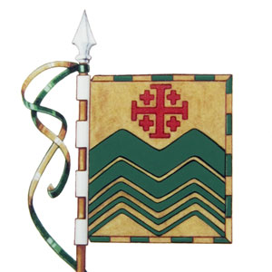Arms of the Municipalité de Saint-Cyrille de LessardBlazonOr a fess dancetty wavy of two peaks Vert between in chief a cross of Jerusalem Gules and in base four bars also dancetty wavy of two peaks Vert the width of the bars diminishing towards base from one half to one sixteenth of the fess; |