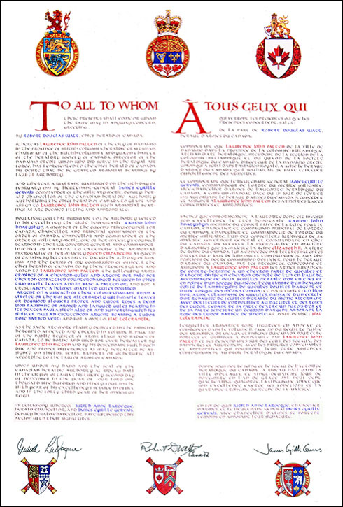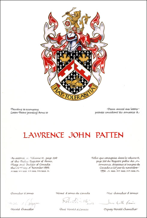 Additional InformationCreator(s)Original concept of Lawrence John Patten, assisted by the heralds of the Canadian Heraldic Authority. PainterAlastair Priestly CalligrapherSuzzann Wright Recipient TypeIndividual |