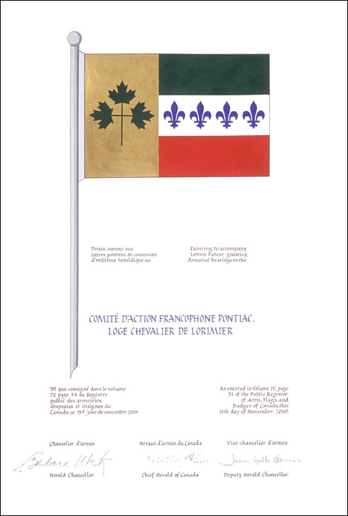 Flag of the Comité d'action francophone Pontiac, Loge Chevalier de LorimierBlazonThe hoist Or a sprig of three maple leaves Vert, the fly tierced in fess Vert, Argent four fleurs-de-lis Azure, and Gules; SymbolismThe green, white and red colours in horizontal bands refer to the flag of the 1837-38 patriotes. The four fleurs-de-lis symbolize the Quebec flag. The maple leaf branch represents the maple leaves found on the flag made by the mother of the patriote Damien Masson of Saint-Eustache. The maple leaf was one of the symbols of French Canadians in the XIXth century. The colour gold symbolizes faith. |