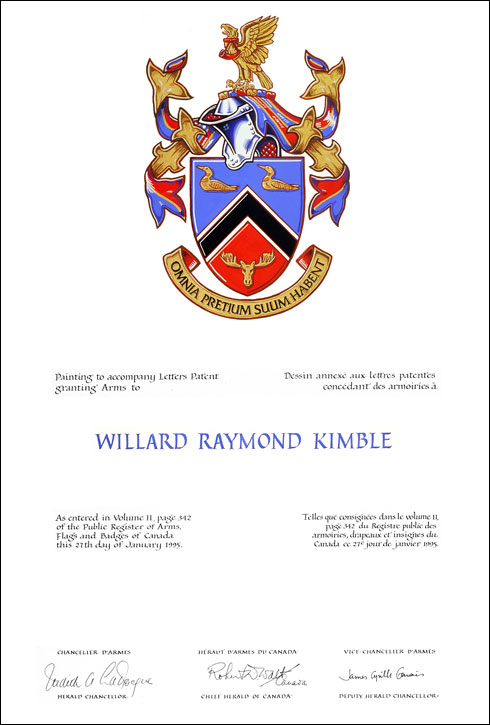 Arms of Willard Raymond KimbleBlazonPer chevron Azure and Gules over all a chevron Sable edged Argent between in chief two loons naiant and in base a moose head caboshed Or; |
