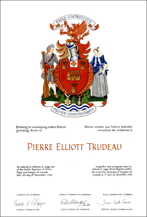 Arms of Pierre Elliott TrudeauBlazonGules a representation of a Montreal dwelling under construction (tempore 1680) between three garbs Or in centre chief on a square billet the mark of the Prime Ministership of Canada (Argent four maple leaves conjoined in cross at the stem Gules); SymbolismThe late 17th–century Montreal townhouse honours Étienne Truteau, a master carpenter who was the original Trudeau ancestor in New France. It also alludes to the idea of building up society inherent in Mr. Trudeau’s own career. The garbs of wheat represent his family’s agricultural heritage from the 18th and 19th centuries. Their number refers to his three sons. The heraldic emblem of the Prime Minister of Canada appears in the upper centre. |