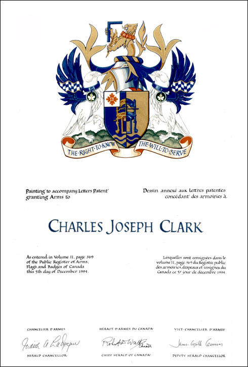 Arms of Charles Joseph ClarkBlazonPer pale Azure and Or a flat bed printing press above a bar gemel wavy in base all counterchanged on a canton the mark of the Prime Ministership of Canada (Argent four maple leaves conjoined in cross at the stem Gules); SymbolismThe printing press symbolizes the involvement of Mr. Clark and his family with newspapers and journalism. The wavy bars refer to High River, Alberta, his birthplace, and the division of the shield alludes to its location at the point where the foothills, represented by the blue, become the prairies, represented by the gold. The heraldic emblem of the Prime Minister of Canada appears in the upper left. |