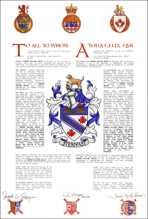 Additional InformationCreator(s)Original concept of Timothy William Leslie, assisted by the heralds of the Canadian Heraldic Authority. PainterDebra Parker CalligrapherNot applicable Recipient TypeIndividual |