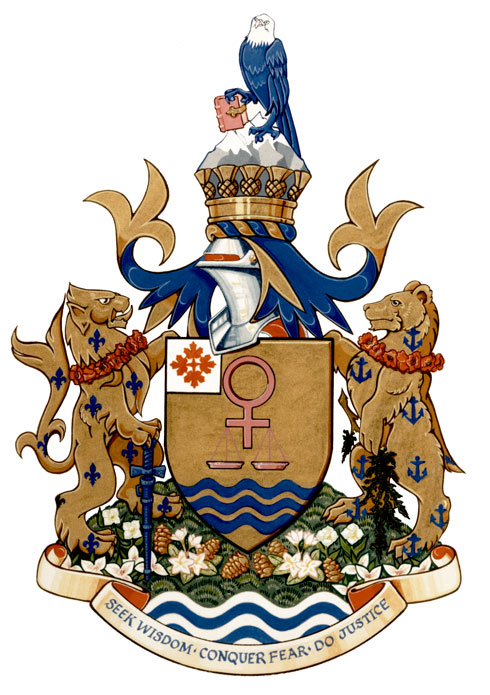 SupportersBlazonOn a grassy mound set with dogwood flowers, trillium flowers and Mayflowers Proper and pine cones Or rising above barry wavy Argent and Azure dexter a lion Or semé of fleurs-de-lys Azure gorged with a collar of poppy flowers Gules its dexter foreclaw resting on the pommel of a sheathed sword point downwards Azure embellished Or sinister a female bear Or semé of anchors Azure gorged with a like collar its dexter forepaw grasping a branch of cedar Vert embellished Or; SymbolismThe lion refers to Ms. Campbell’s father, with the poppies recalling his war service and the fleurs-de-lis his Montreal birthplace. The sword also refers to his military service and to the fact that Ms. Campbell served as Minister of National Defence. It is sheathed to refer to preparedness and defence of peace. The bear symbolizes British Columbia as well as Ms. Campbell’s Soviet studies, the bear being a symbol of Russia. The anchors refer to her mother's service in the Royal Canadian Navy. The cedar branch is a First Nations symbol honouring the nurturing and caring characteristics of women. The grass and water represent the land, rivers, lakes and oceans of Canada. Ms. Campbell’s ancestral heritage is symbolized by the provincial flowers of Nova Scotia, Ontario and British Columbia, as well as by the pine cones, a reference to the 17th century pine tree emblem of Massachusetts. |