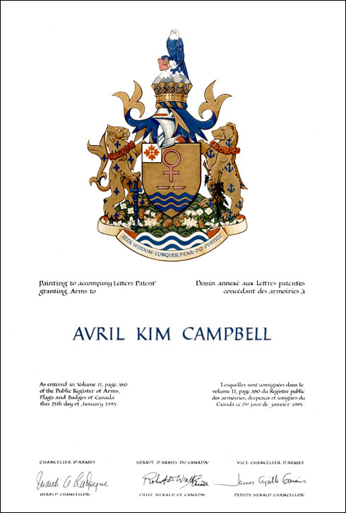 Arms of Avril Kim CampbellBlazonOr the universal symbol for a woman pendant from its crosspiece a pair of scales Rose and in base three bars wavy Azure on a canton the mark of the Prime Ministership of Canada (Argent four maple leaves conjoined in cross at the stem Gules); SymbolismThe scales of justice refer to Ms. Campbell’s legal profession and to her service as Minister of Justice. They are shown with the universal symbol for a woman, indicating that she was the first woman to be Prime Minister of Canada. Pink is a reference to the distinctive colour used in her 1993 campaign for the leadership of the Progressive Conservative party. The three wavy blue bars, also found in the arms of Ms. Campbell’s home province of British Columbia, refer to both the Pacific Ocean and to three major elements of her career: the law, teaching and politics. The heraldic emblem of the Prime Minister of Canada appears in the upper left. |