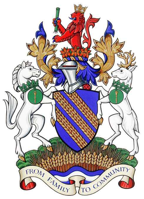 SupportersBlazonOn grassy hills Vert set behind a field of durum wheat Or rising above barry wavy Azure and Argent dexter a horse Argent unguled Or gorged with a coronet erablé Vert pendant therefrom a pomeis charged with a representation of the mace of the Legislative Assembly of the Province of Saskatchewan Or sinister a deer Argent attired and unguled Or gorged with the same collar and pendant; |