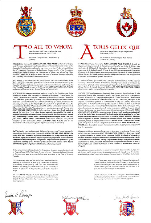 Additional InformationCreator(s)Original concept of Robert D. Watt, Chief Herald of Canada, assisted by the heralds of the Canadian Heraldic Authority. PainterJoan Bouwmeester CalligrapherJoan Bouwmeester Recipient TypeIndividual Special DesignationLieutenant Governor |
