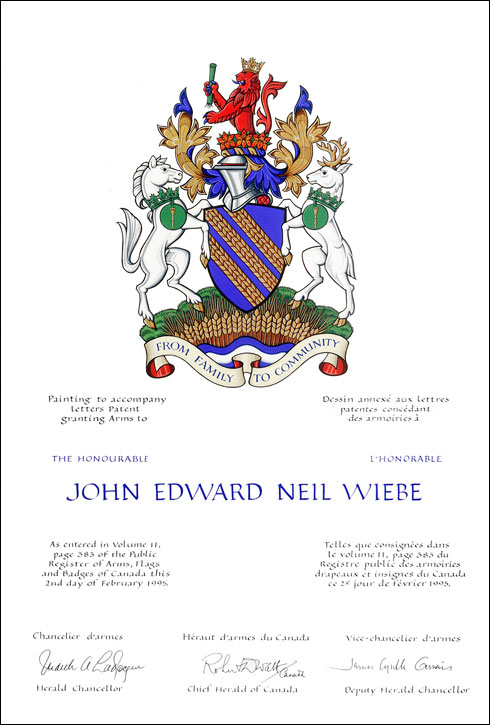 Arms of John Edward Neil WiebeBlazonAzure three bends tapissé of wheat Or; |