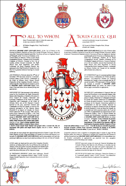 The contents of this Register are intended for research purposes only. The heraldic emblems found in the Register may not be reproduced in any form or in any media without the written consent of the Canadian Heraldic Authority and/or the recipient.
