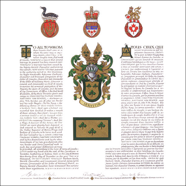 Additional InformationCreator(s)Original concept of Robert D. Watt, Chief Herald of Canada, assisted by the Heralds of the Canadian Heraldic Authority PainterEva Pilar-Cass CalligrapherJudith Bainbridge Recipient TypeIndividual |