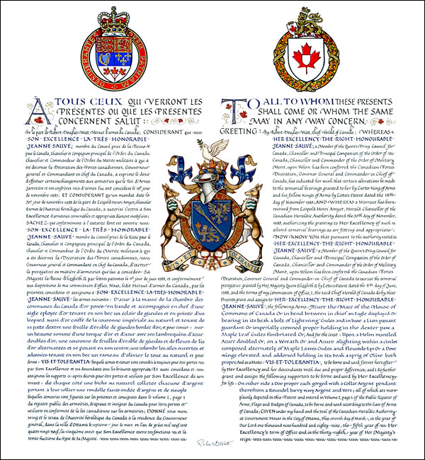 Additional InformationCreator(s)Original concept of Robert D. Watt, Chief Herald of Canada, assisted by the heralds of the Canadian Heraldic Authority. PainterGordon Macpherson CalligrapherJudith Bainbridge Recipient TypeIndividual Special DesignationGovernor General |