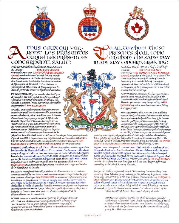 Additional InformationCreator(s)Original concept of Robert D. Watt, Chief Herald of Canada, assisted by the heralds of the Canadian Heraldic Authority. PainterDonald Hallman CalligrapherJohn Whitehead Recipient TypeIndividual |