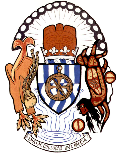 CrestBlazonA coronet of maple leaves Argent a representation of a copper displaying the beaver crest of Chief Ninstints of the Haida people framed with a corona of eagle feathers all Proper; SymbolismA traditional symbol of Canada noted for its industrious skills, the beaver was a major family emblem of Pacific Coast First Nations. This beaver image is taken from a ceremonial copper in the collection of the museum bearing the mark of Chief Ninstints, of the Haida people. The fan of eagle feathers is a traditional symbol of honour of the Plains First Nations. The maple leaf is one of Canada’s national emblems. |