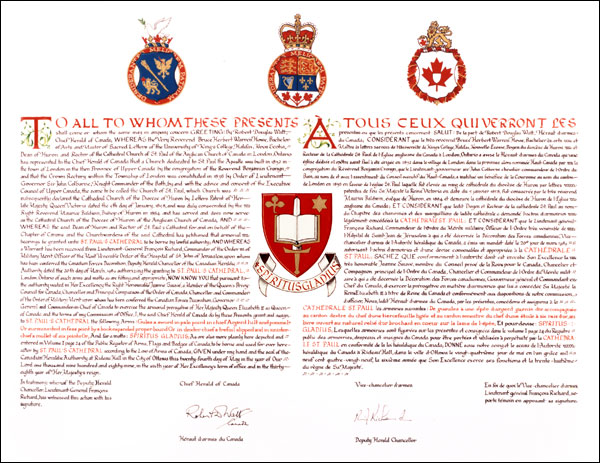 Additional InformationCreator(s)Original concept of David Bowyer, assisted by the heralds of the Canadian Heraldic Authority. PainterDavid Bowyer CalligrapherDavid Bowyer Recipient TypeCivil Institution