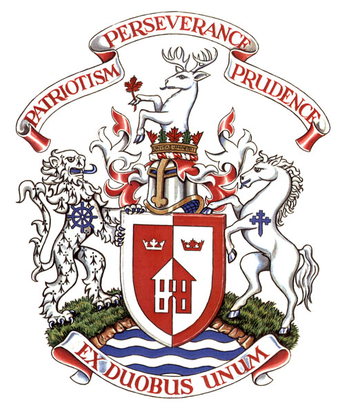 CrestBlazonIssuing out of a Loyalist civil coronet (rim Or, maple leaves Gules, oak leaves Vert lettered Sable) a demi stag Argent bearing in its dexter hoof a leaf of the Silver Maple Gules; |