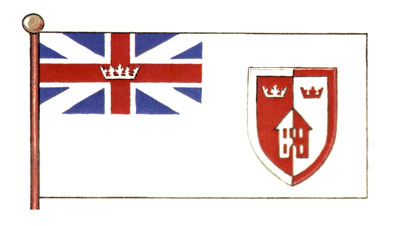 Arms of the Town of PictonBlazonPer pale Gules and Argent a representation of a Georgian town building between two maple leaf coronets in chief within a bordure all counterchanged; |
