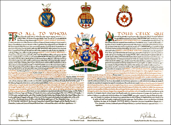 Additional InformationCreator(s)Original concept of Robert D. Watt, Chief Herald of Canada, assisted by the heralds of the Canadian Heraldic Authority. PainterDavid Bowyer CalligrapherDavid Bowyer Recipient TypeIndividual Special DesignationLieutenant Governor |