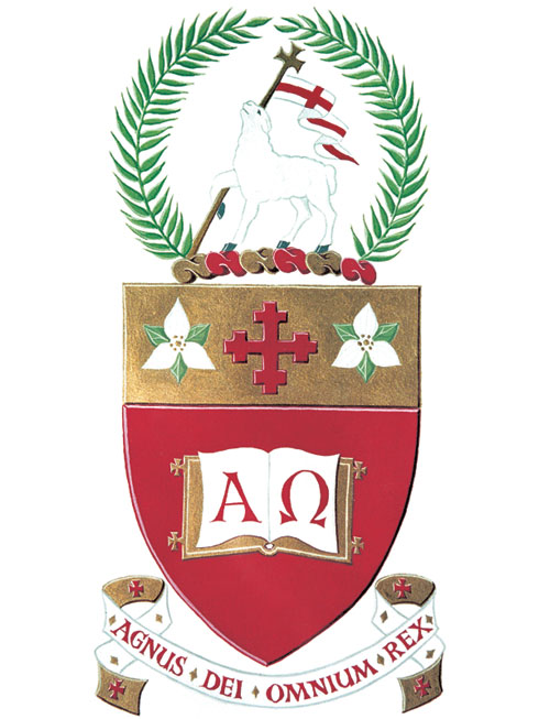 Arms of Redeemer CollegeBlazonGules an open book proper edged bound and clasped Or the pages inscribed with the Greek letters Alpha and Omega Gules on a chief Or a cross crosslet Gules between two trillium flowers Argent barbed and seeded proper; |