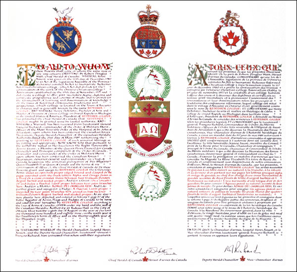 Other InformationThe recipient's emblems were subsequently recorded in the name of Redeemer University College in the Public Register of Arms, Flags and Badges of Canada, Volume IV, page 526, 15 September 2005. |