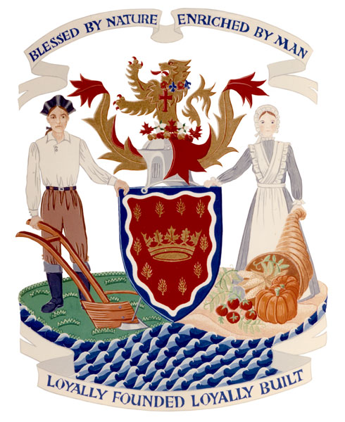 SupportersBlazonDexter a man habited as a Loyalist farmer settler his dexter hand resting on a plough all proper sinister a woman habited as a Loyalist settler her sinister hand supporting a cornucopia spilling forth corn, tomatoes, peas and pumpkins the whole resting on a compartment composed of dexter a grassy field sinister a beach of sand all proper and rising above waves Azure crested Argent; |