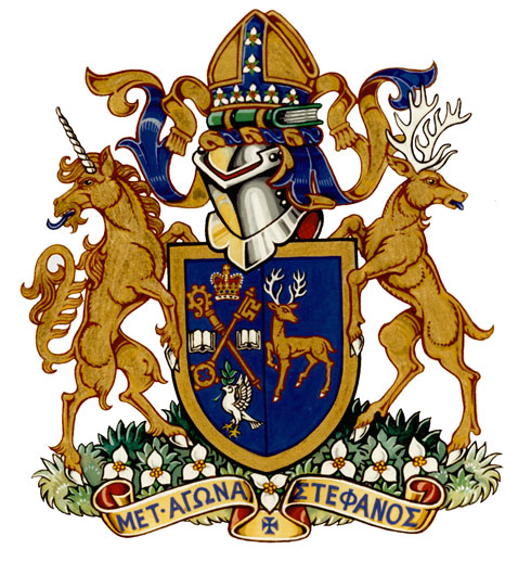 Arms of The University of Trinity CollegeBlazonThe Arms of the Anglican Bishopric of Toronto namely Azure a crosier in bend dexter surmounted by a key in bend sinister Or between an Imperial Crown in chief two open books in fess proper and a dove in base Argent holding in the beak an olive branch Vert impaling Azure a stag trippant reguardant Or attired and unguled Argent all within a bordure Gold; SymbolismThe design is based on the arms used by the college since 1857, namely the arms borne by the Right Reverend John Strachan, the first bishop of Toronto and the founder of the college. The left side is the arms of the diocese of Toronto, granted in 1839. The right side is based on Scottish Strachan arms, with the stag made unique to John Strachan by the position of the head and the colour of the antlers and hooves. The border around the shield differentiates the bishop’s arms from the college’s arms. Blue and gold are the college’s academic colours. |