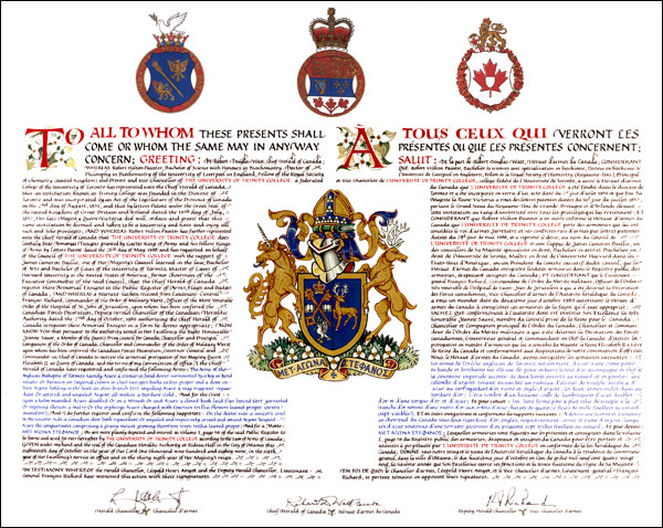 CrestBlazonA closed book laid flat bound Vert garnished Or reposing thereon a mitre Or the orphreys Azure charged with fourteen trillia flowers leaved proper (seven manifest); SymbolismThe mitre, a symbol of a bishop’s authority, is taken from the arms used by Bishop Strachan. The book indicates the college’s educational function. The trillium flowers are the provincial symbol of Ontario and an allusion to the Holy Trinity in whose honour the college was named. Their number alludes to the seven original faculties of the college. |