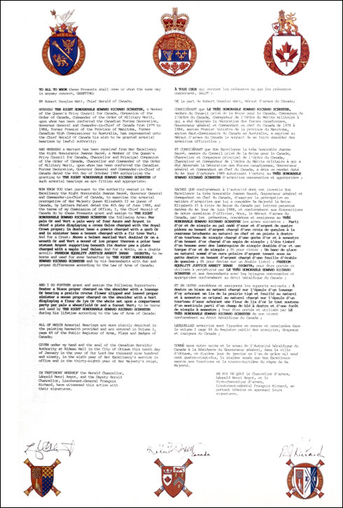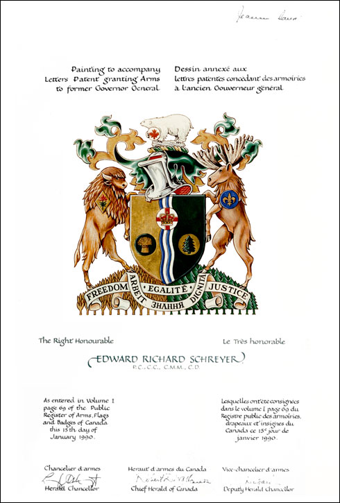 Additional InformationCreator(s)Original concept of Bruce Beatty, assisted by the heralds of the Canadian Heraldic Authority. PainterDonald Hallman CalligrapherNancy Ellis Recipient TypeIndividual Special DesignationGovernor General |