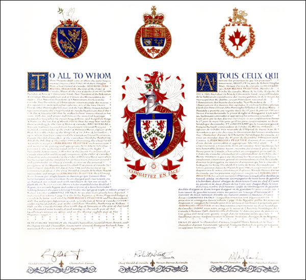 Additional InformationCreator(s)Original concept of Robert D. Watt, Chief Herald of Canada, assisted by the heralds of the Canadian Heraldic Authority. PainterJoan Bouwmeester CalligrapherJoan Bouwmeester Recipient TypeIndividual Other InformationThe recipient's emblems are based on the armorial bearings originally recorded in the name of his father, Henri Elzear John Burroughs Pelletier, at the College of Arms, London, England, 1 March 1930. |