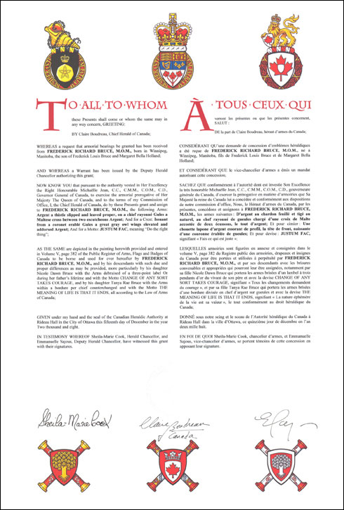 Additional InformationCreator(s)Original concept of Darrel Kennedy, Assiniboine Herald, assisted by the heralds of the Canadian Heraldic Authority. PainterIlona Jurkiewicz CalligrapherShirley Mangione Recipient TypeIndividual |