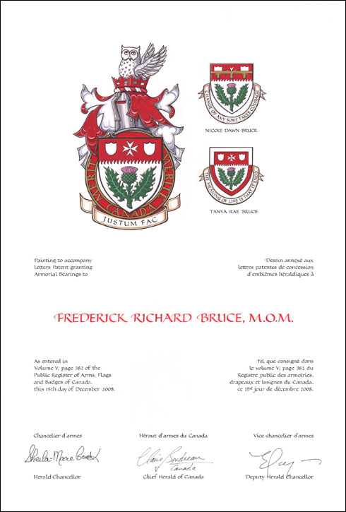 Arms of Frederick Richard BruceBlazonArgent a thistle slipped and leaved proper, on a chief rayonné Gules a Maltese cross between two escutcheons Argent; SymbolismThe red upper section is taken from the Arms of the Chief of the Bruce clan in Scotland, except that the lower edge represents the flame of inspiration important to a life-long learner and teacher. The small escutcheons are shown in the shape of a police badge as used in Canadian heraldry. Together, these represent Mr. Bruce’s long service as a police officer, which culminated as a chief of police. The thistle is a symbol of his Scottish heritage. The Maltese cross alludes to his long service to St. John Ambulance and in the Most Venerable Order of the Hospital of St. John of Jerusalem. |