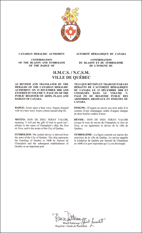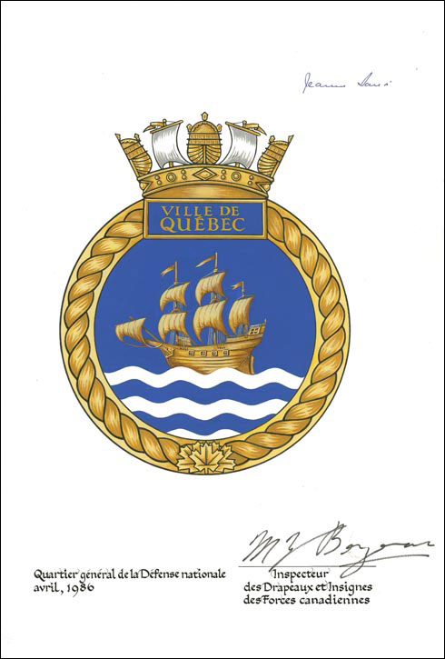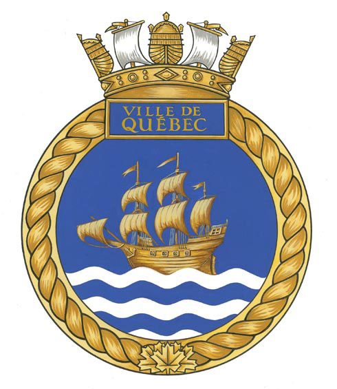 Badge of H.M.C.S. Ville de QuébecBlazonAzure upon a base wavy Argent charged with two bars wavy Azure a three-masted ship Or; SymbolismThe central device is derived from the arms of the City of Quebec. The ship represents the founding of Quebec in 1608 by Samuel de Champlain and the subsequent establishment of Quebec as an important port. |