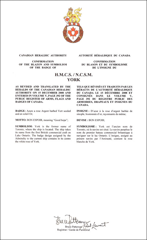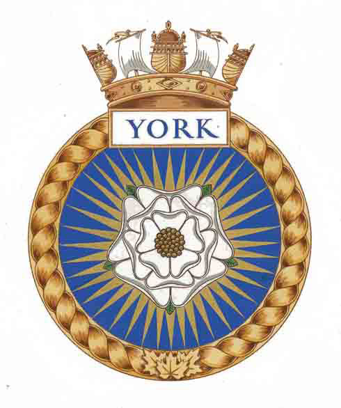 Badge of H.M.C.S. YorkBlazonAzure a rose Argent barbed Vert seeded and en soleil Or; SymbolismYork is the former name of Toronto, where the ship is located. The ship takes its name from the first British commercial craft on Lake Ontario. The badge design assigned by the Admiralty to the current ship contains in its centre the white rose of York. |