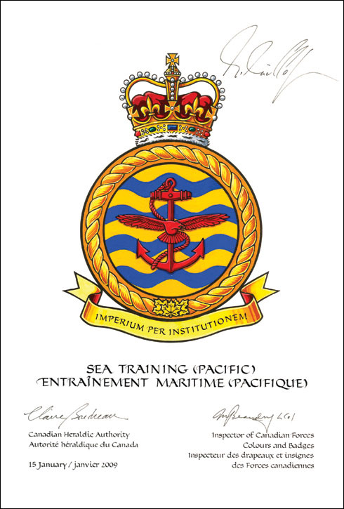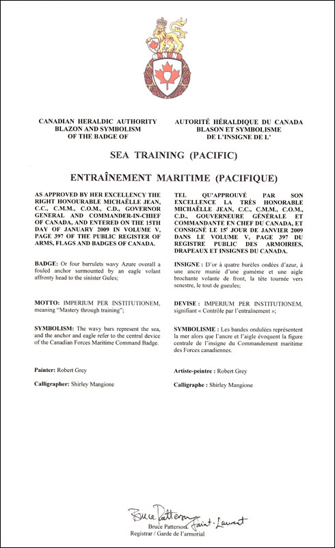 Badge of Sea Training (Pacific)BlazonOr four barrulets wavy Azure overall a fouled anchor surmounted by an eagle volant affronty head to the sinister Gules; SymbolismThe wavy bars represent the sea, and the anchor and eagle refer to the central device of the Canadian Forces Maritime Command Badge. |