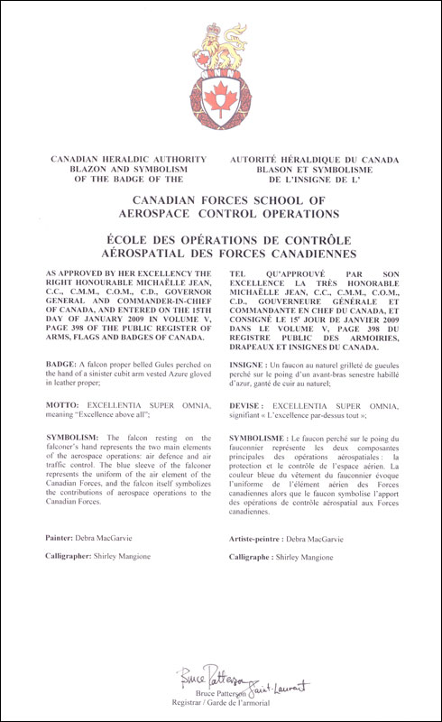 Badge of the Canadian Forces School of Aerospace Control Operations (CFSACO)BlazonArgent a falcon proper belled Gules perched on the hand of a sinister cubit arm vested Azure gloved in leather proper; SymbolismThe falcon resting on the falconer’s hand represents the two main elements of the aerospace operations: air defence and air traffic control. The blue sleeve of the falconer represents the uniform of the air element of the Canadian Forces, and the falcon itself symbolizes the contributions of aerospace operations to the Canadian Forces. |