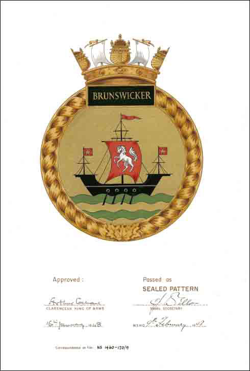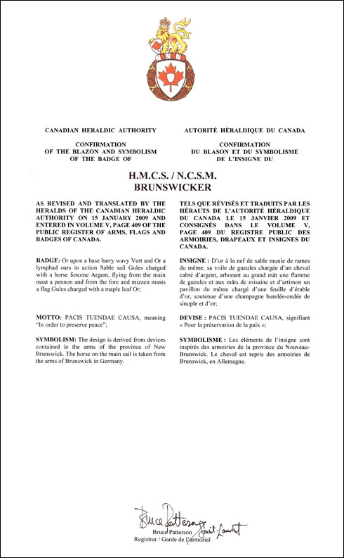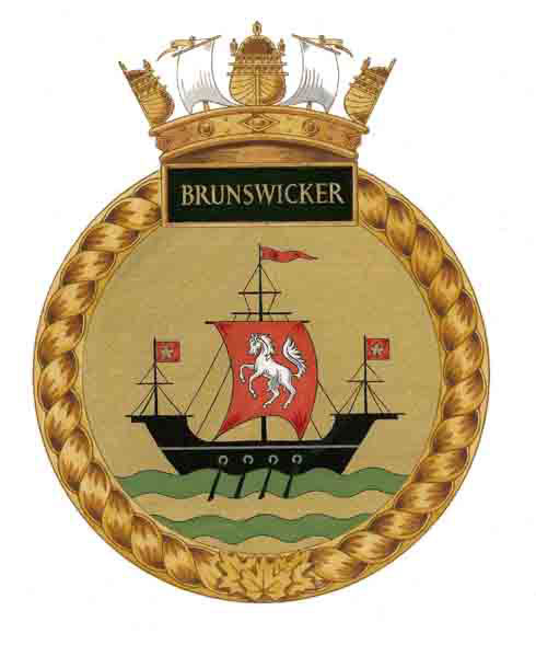 Badge of H.M.C.S. BrunswickerBlazonOr upon a base barry wavy Vert and Or a lymphad oars in action Sable sail Gules charged with a horse forcene Argent, flying from the main mast a pennon and from the fore and mizzen masts a flag Gules charged with a maple leaf Or; SymbolismThe design is derived from devices contained in the arms of the province of New Brunswick. The horse on the main sail is taken from the arms of Brunswick in Germany. |