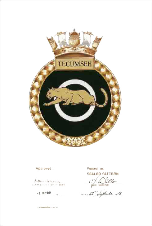 Badge of H.M.C.S. TecumsehBlazonSable an annulus Argent surmounted by a panther crouching to spring Or; SymbolismThe crouching panther shown against the darkness of the night sky represents the celestial panther, the totem of the clan to which the great Shawnee warrior and leader Tecumseh (c. 1768-1813) belonged. Tecumseh’s name, literally “I cross the path”, has also been translated as “a panther crouching in wait”. The annulus marks the unity of the various tribes originally from the Ohio region brought together by Tecumseh and allied with the British in the War of 1812. |