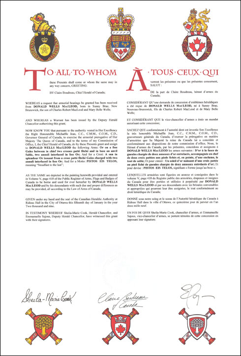 Additional InformationCreator(s)Original concept of Donald Wells MacLeod, assisted by the heralds of the Canadian Heraldic Authority. PainterLinda Nicholson CalligrapherShirley Mangione Recipient TypeIndividual |