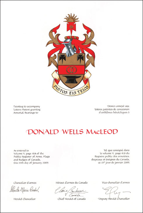 Arms of Donald Wells MacLeodBlazonOr on a fess Gules between in chief two crosses patté fitché and in base an anvil Sable, two annuli interlaced in fess Or; SymbolismThe red and gold colours and the two crosses allude to the Arms of MacLeod of Raasay. The fess represents unbroken affection and loyalty linking the many generations on both sides of the Atlantic Ocean. The anvil symbolizes the blacksmith occupation of Mr. MacLeod’s father and grandfather. The interlaced rings represent honour and virtue. |