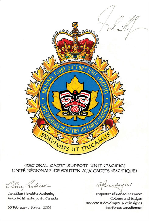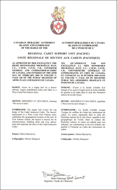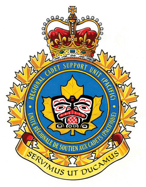 Badge of the Regional Cadet Support Unit (Pacific)BlazonAzure on a maple leaf Or a beaver affronty Argent embellished Gules and Sable in a West Coast First Nations style; SymbolismThe maple leaf evokes the cap badge of the Cadet Instructor Cadre. The beaver, represented in a West Coast First Nations style, establishes the geographical location of the unit. In First Nations culture, the beaver is known for its industriousness, building skills and wise advice, traits that represent the ethos of the Cadet Instructor Cadre. |