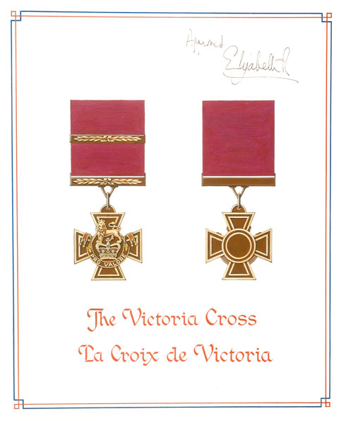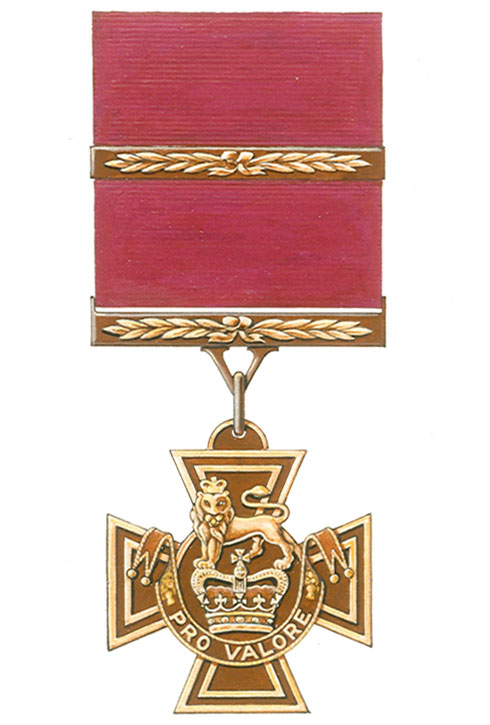Insignia of the Victoria CrossBlazonSuspended from a ribbon Murrey by a letter V affixed to the lower edge of a clasp bearing two laurel branches bound by a ribbon, a bronze cross pattee charged with the Royal Crest of the United Kingdom of Great Britain and Northern Ireland (On the Royal Crown a lion statant guardant royally crowned) above a scroll inscribed PRO VALORE (meaning “For valour”), each end draped over the dexter and sinister limbs of the cross; SymbolismThe design is essentially that of the original Victoria Cross, instituted by Royal Letters patent on 29 January 1856. The use of the Royal Crest as used by Queen Victoria indicates that the Sovereign is the source of the award; it is also appropriate as a reference to the name of the award and to the involvement Queen Victoria had in its creation. The laurels in the clasp are a traditional symbol of victory. |