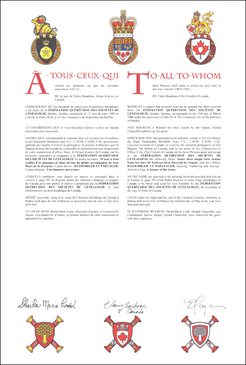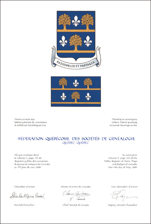 Arms of the Fédération québécoise des sociétés de généalogieBlazonAzure three maple trees issuant from two bars Or between three fleurs-de-lis Argent; SymbolismThe blue and gold refer to the Fédération’s Quebec origins. The three maple trees represent all genealogical societies. The leafy tree has always symbolized this discipline because of the common expression “to trace one’s family tree.” The tree at the base of the shield represents the first ancestor, and the two trees in chief represent the growing families. The two bars allude to the lines on the pages of a book, symbolizing both the Fédération’s cultural mandate through the distribution of articles and other publications, as well as its many awards presented to young people and to historical and genealogical publications. The three fleurs-de-lis represent first, the French aspect of the Fédération’s name; second, the majority of societies belonging to the FQSG that are from Quebec; and third, their international partners that also speak the French language. |