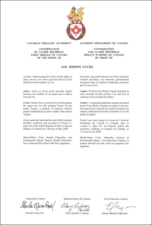 Arms of Jan Joseph ŁuckiBlazonAzure an arrow point upwards Argent between two mullets of six points and in base a crescent Or; SymbolismThis is the coat of arms generally known in the Polish armorial tradition as Sas, to which Mr. Łucki is entitled by descent. |