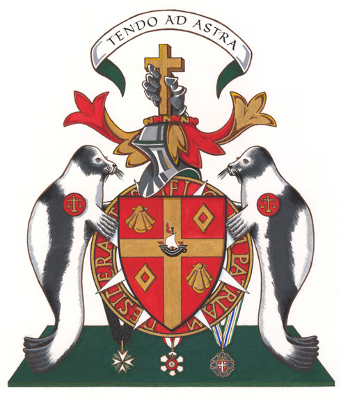 Arms of John Carnell CrosbieBlazonGules on a cross between in dexter chief and sinister base an escallop and in sinister chief and dexter base a mascle Or, a lymphad Sable its sail Argent its flags Gules; SymbolismThese are the arms designed for His Honour’s brother Andrew Crosbie in 1970, with the border of a second son removed to show His Honour’s senior place in the family. The yellow cross on red is the basic coat of arms of the Crosbies of Dumfries in the Scottish border region, the prominent cross making a pun on the name Crosbie. The shells are taken from Scottish Graham arms and mark the Graham ancestry of the family. The diamond shapes mark the family’s mercantile endeavours, and the ship indicates the shipping and fish export aspects of the family firm, Crosbie and Company, founded by His Honour’s grandfather, Sir John Chalker Crosbie. |