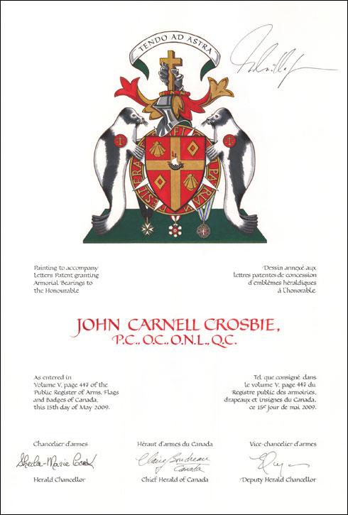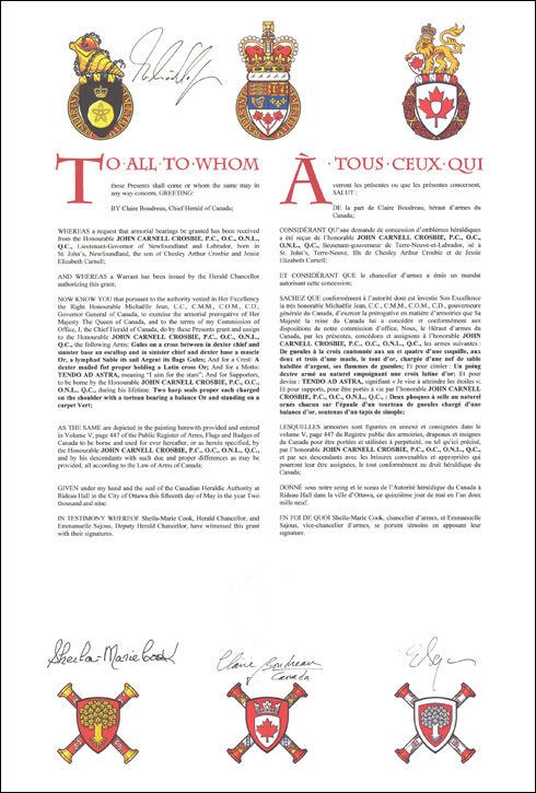 Additional InformationCreator(s)Original concept of Malcolm Innes of Edingight, then Marchmont Herald at the Court of the Lord Lyon, Edinburgh (Arms, Crest and Motto) and Bruce Patterson, Saint-Laurent Herald (Supporters), assisted by the heralds of the Canadian Heraldic Authority. PainterCatherine Fitzpatrick CalligrapherShirley Mangione Recipient TypeIndividual Special DesignationLieutenant Governor |