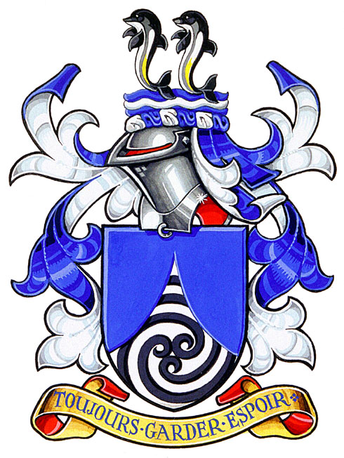 CrestBlazonUpon barry wavy Azure and Argent two Atlantic white sided dolphins proper; SymbolismThe dolphins are Ms. Lauzon’s favourite mammal and represent her and her husband. |