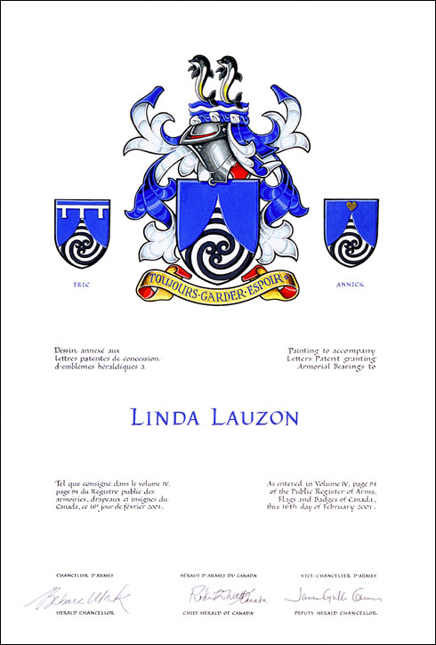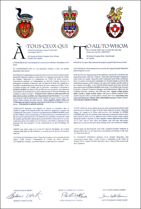 Grant of Arms, with differences to Eric Lauzon and Annick Lauzon